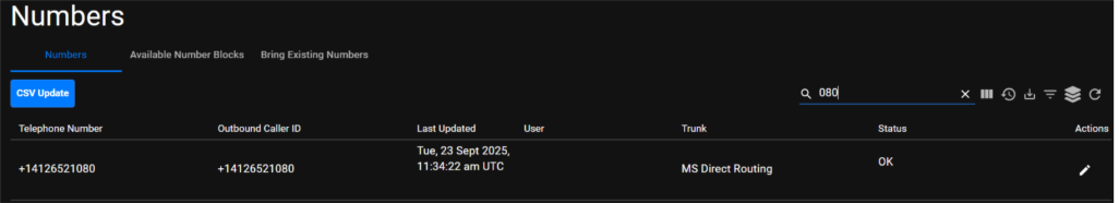 Step 5: Once the number has updated the status will show as ‘OK’ and the relevant trunk is now assigned. It can then be allocated to the relevant user: